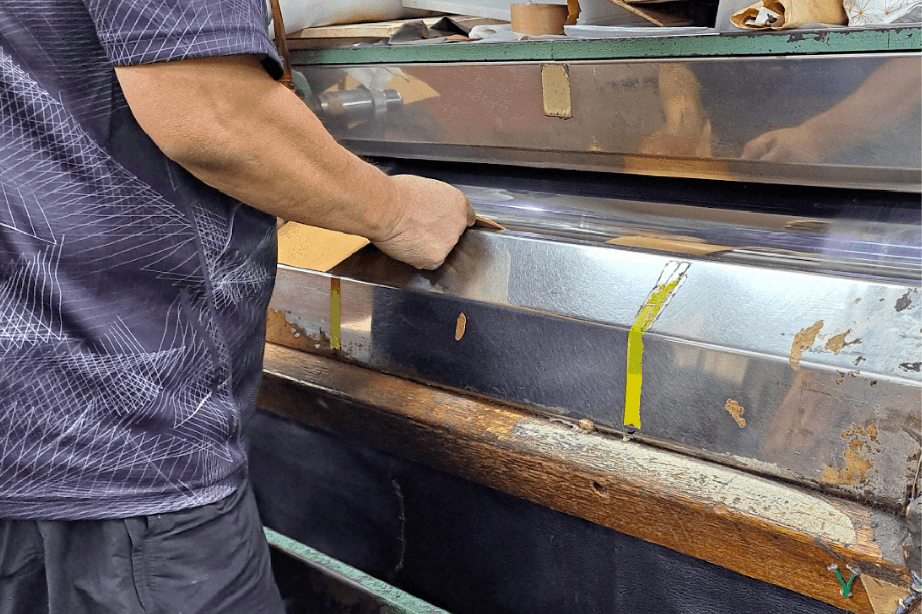 縦に長い鉄製の板を加熱し、そこに革の塗膜面を接触させて、裏側からローラーを押し当てた状態で移動していくことで加圧していくもの。ゴムの板で圧力を調整できるので、ハイドリックアイロンなどと比べて、革を傷めることなくツヤを出すことができます。