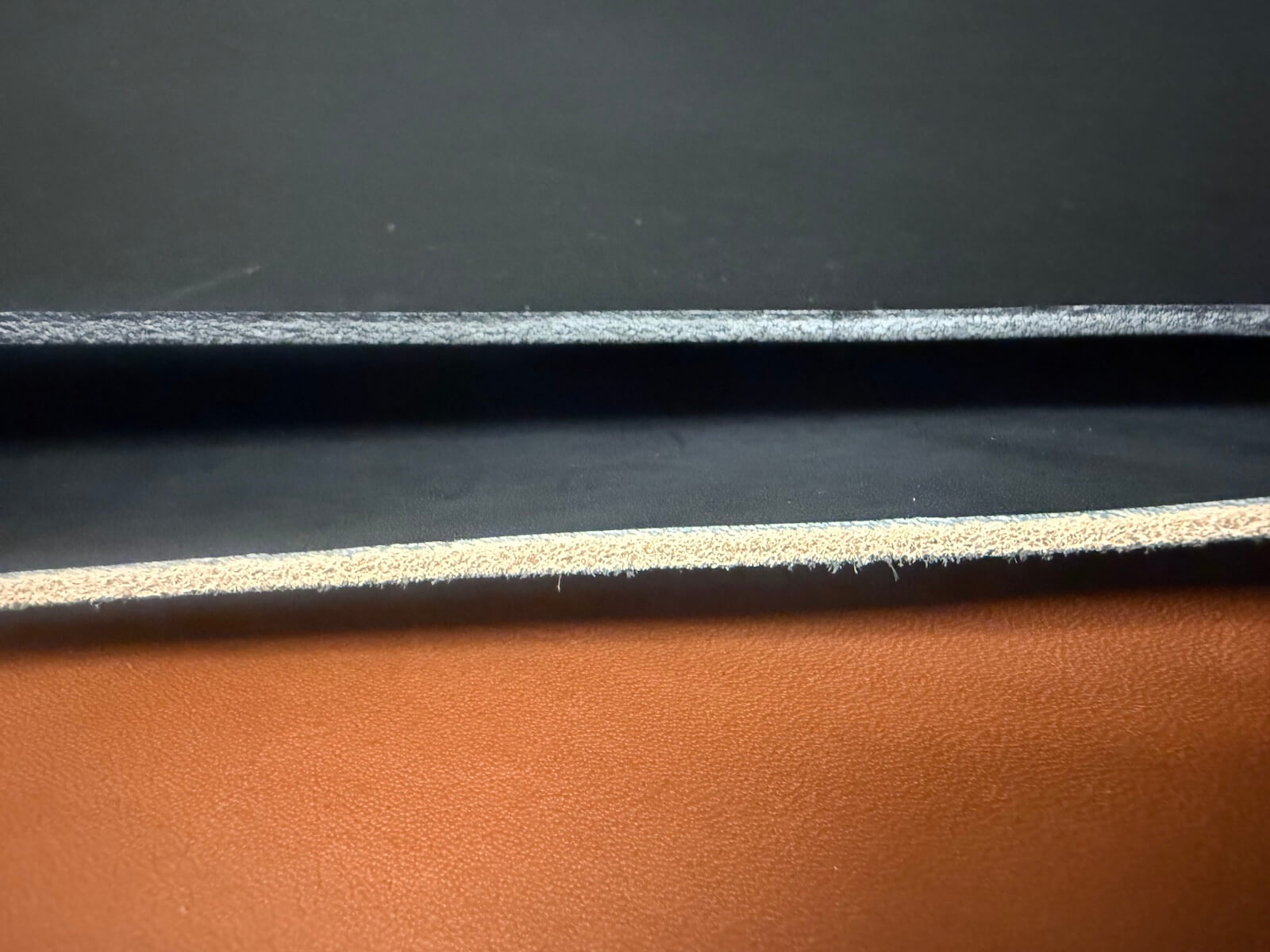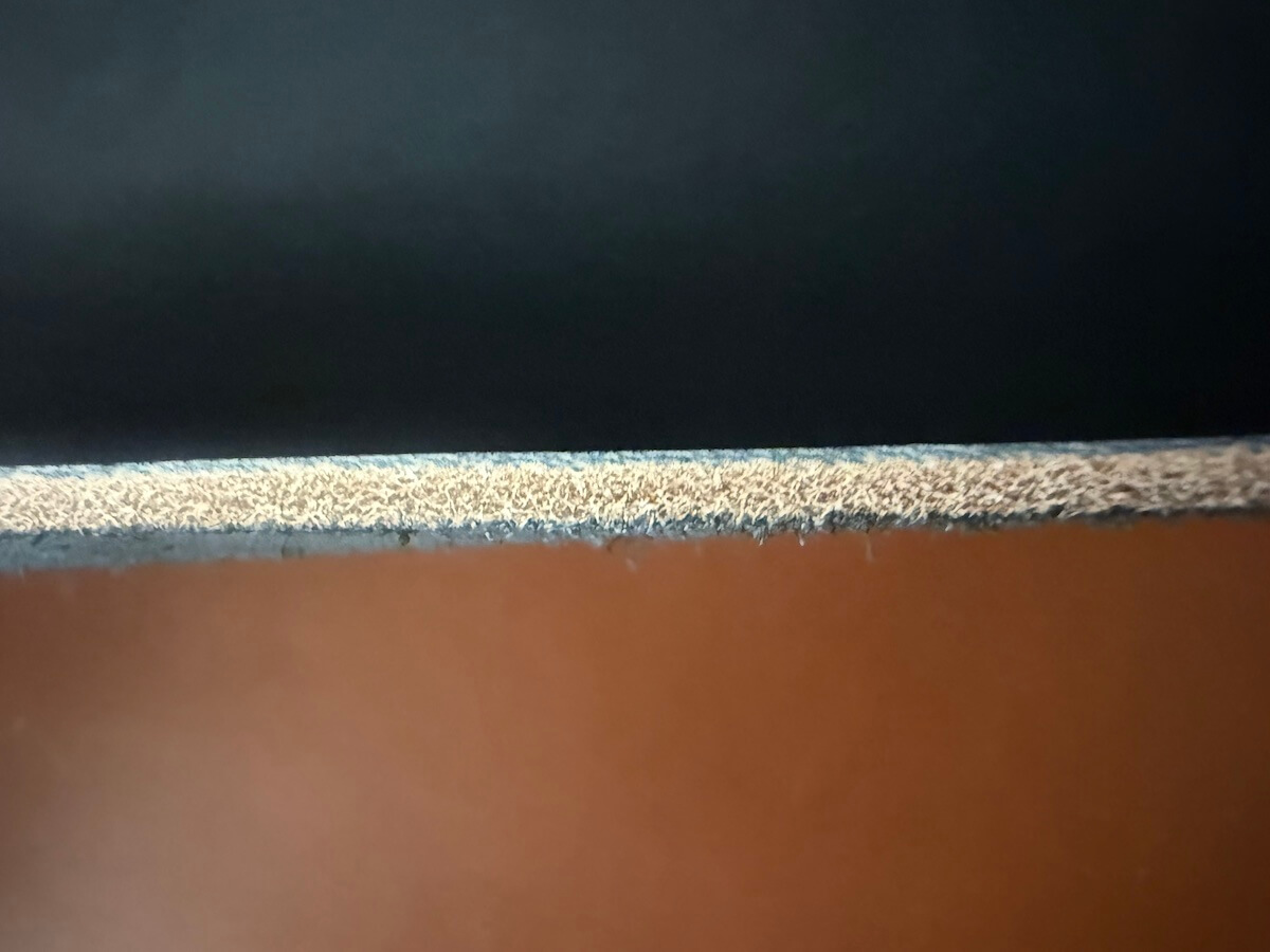 しっかりと芯通しされた『リオダブルバット』の断面。3.8/4.0mm厚の革を繊維をほぐしすぎないように芯通しするには豊富な経験と相当な時間を要します。