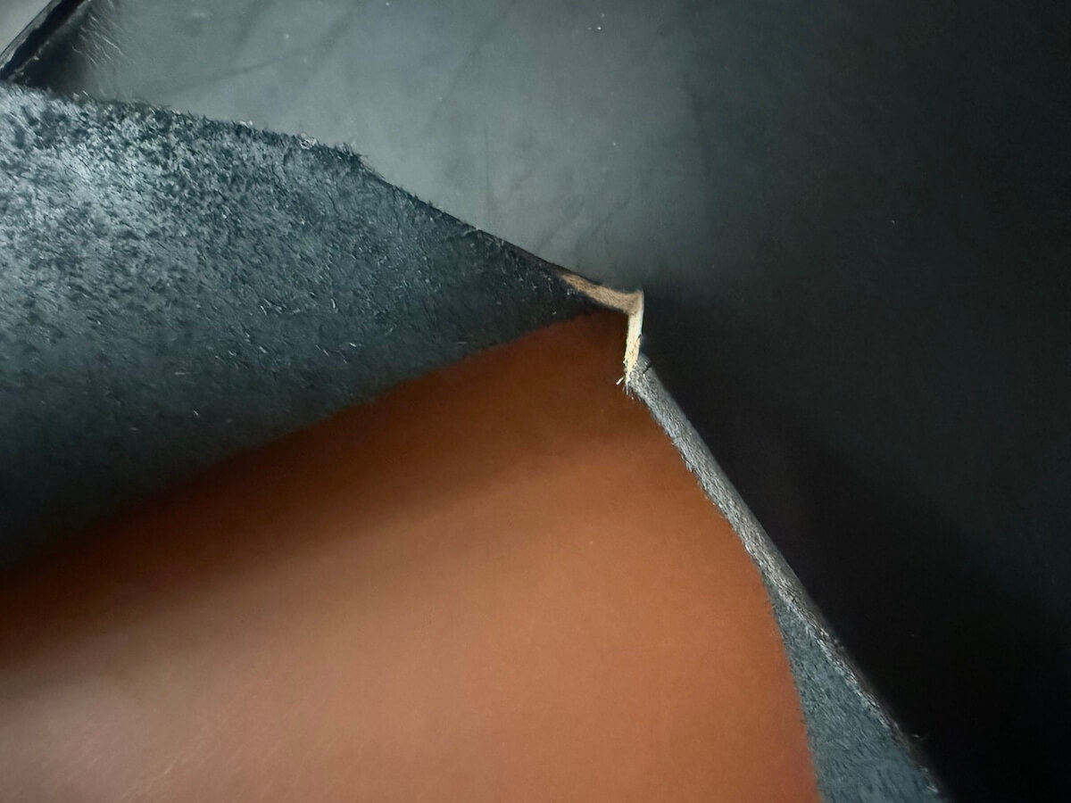 革の裂け目を見ると、芯通しされていないことがよく分かります。