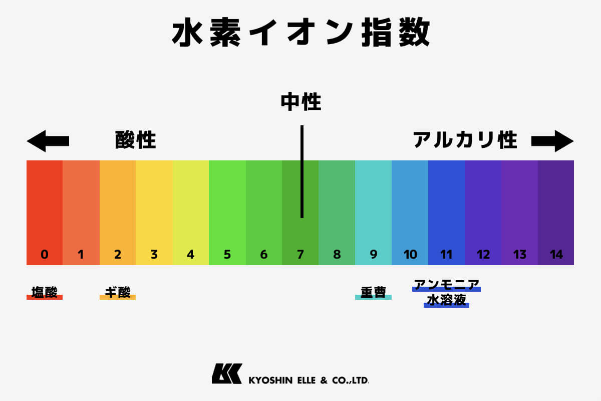 PHの数値と、革づくりによく使用される薬剤を図にしました。