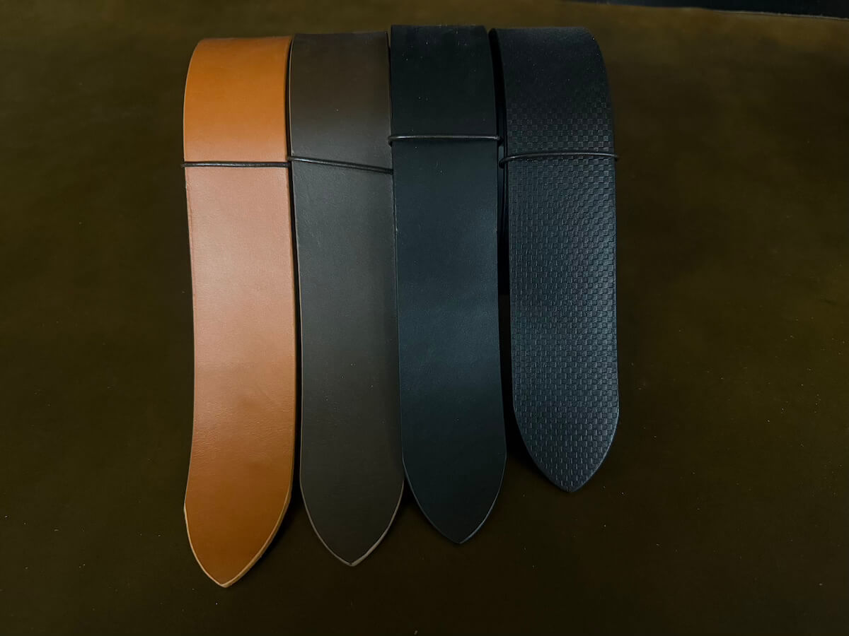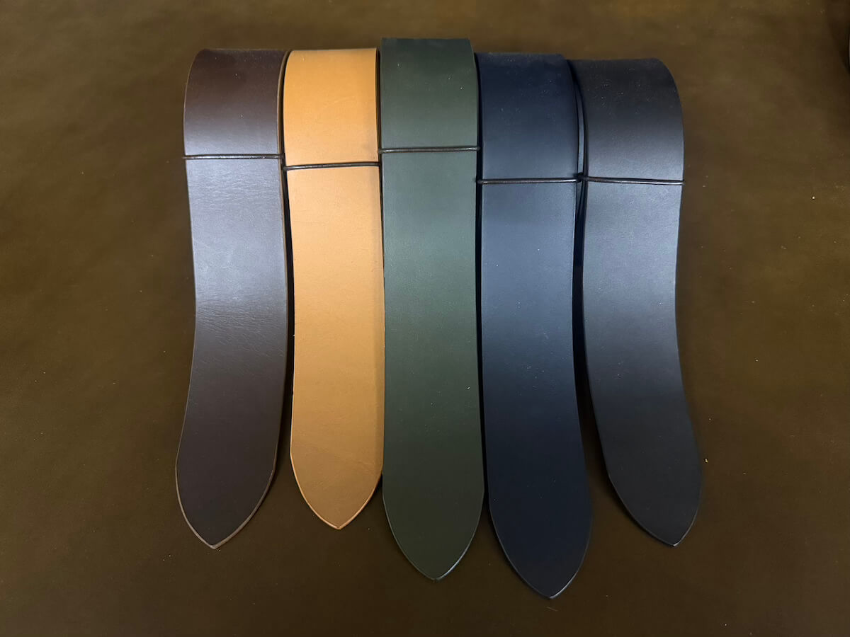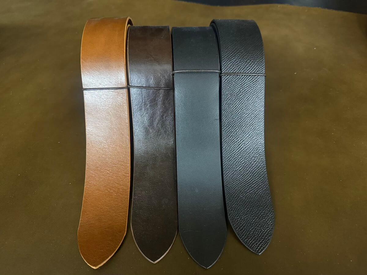 モンタナ社の3.8/4.0mmあるダブルバットです。オイルタッチで経年変化が楽しめるバケッタレザーです。裏もきれいに加工されていますので、締め心地の良い一枚革のベルト用に向いています。