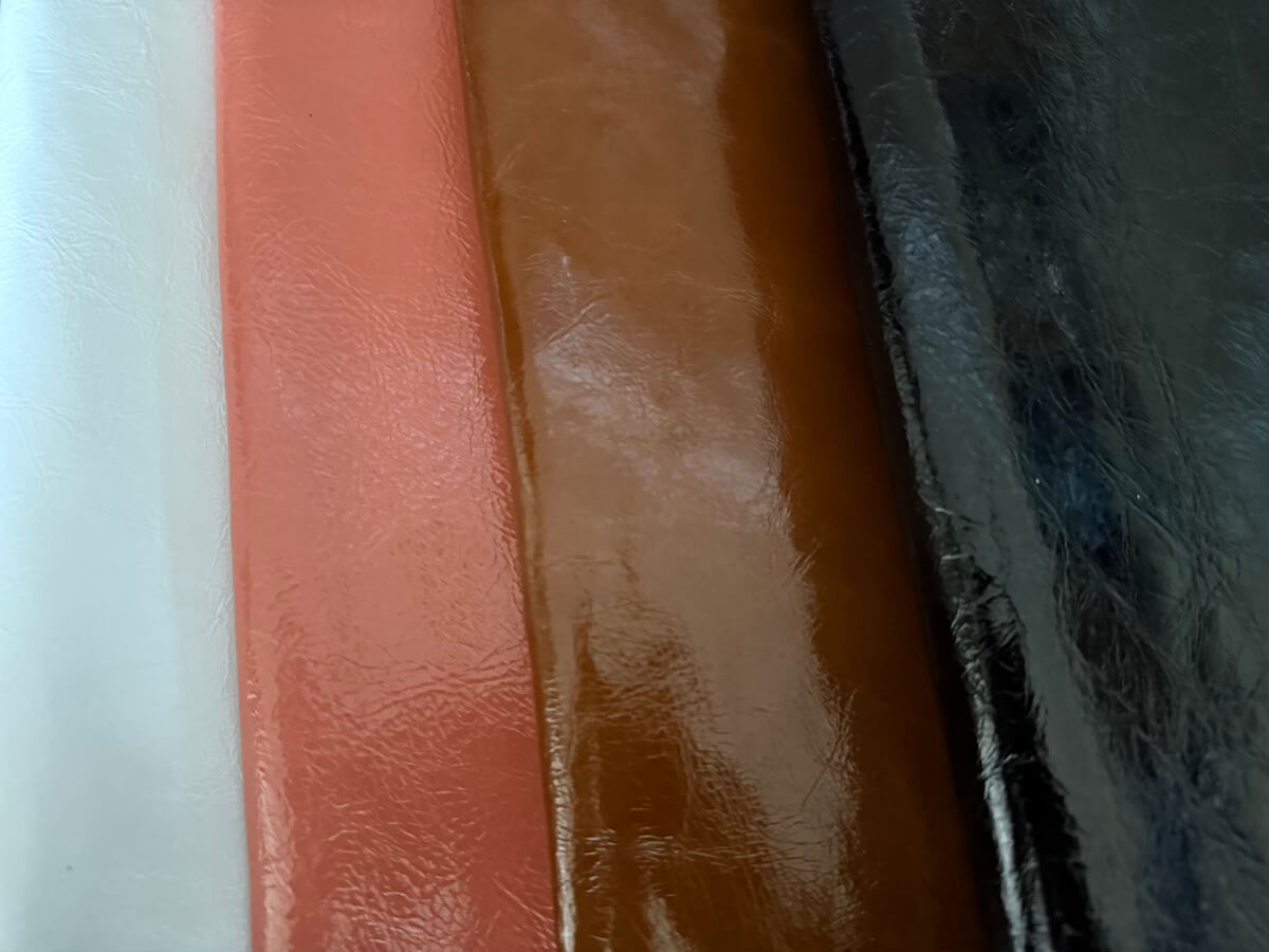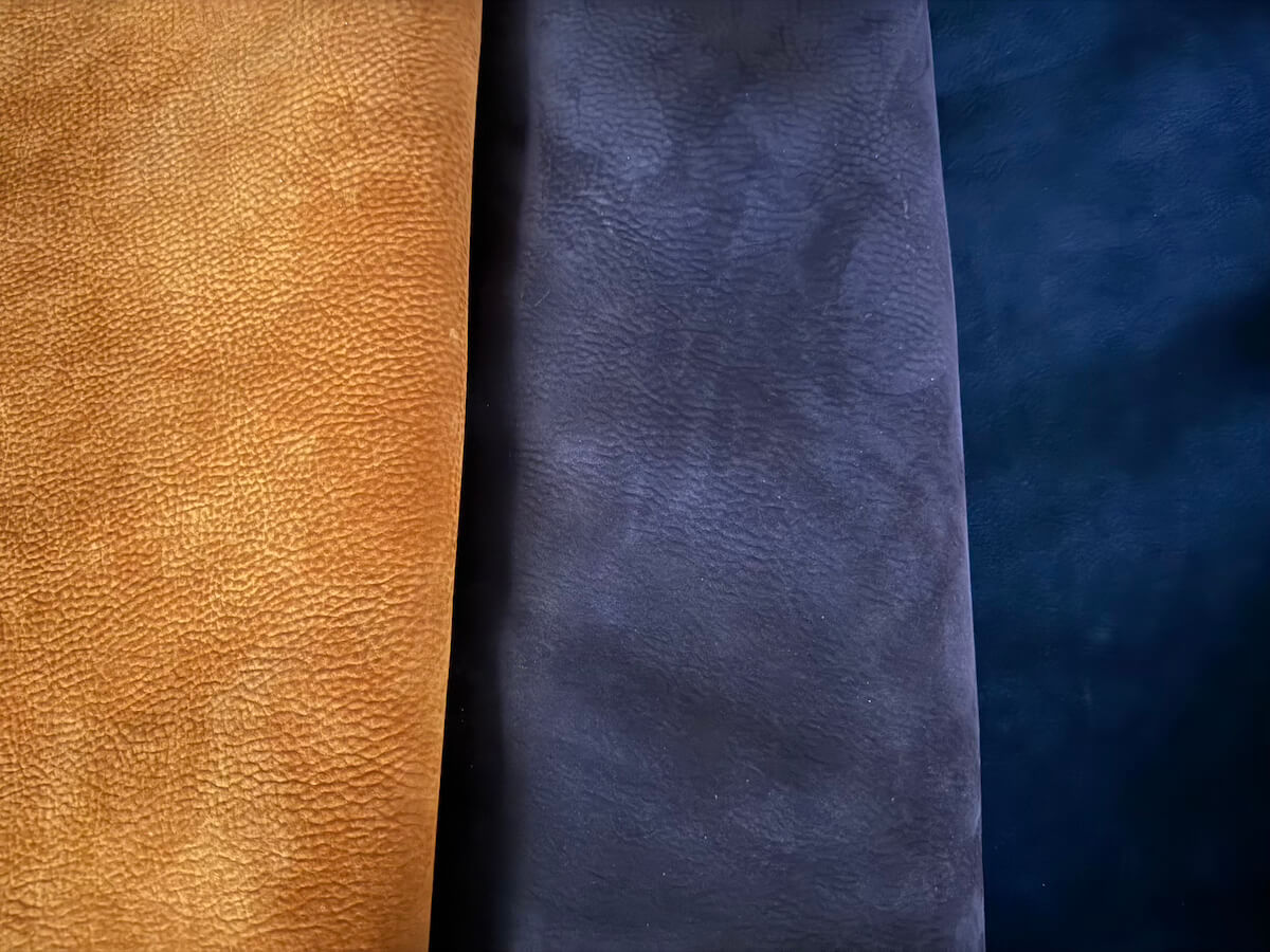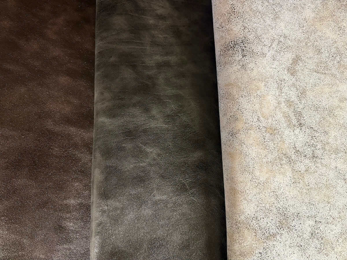 ブレターニャ社のヌメショルダー最新作。右からクラッキング加工、フィルム加工、ベロアのフィルム加工。