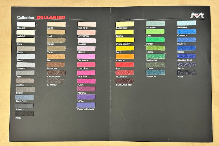 牛原皮の半裁を使用しています。クローム鞣しの発色の良い色合いの型押し革です。しなやかなコシが特徴で、イタリアらしい上品な仕上げになっています。
