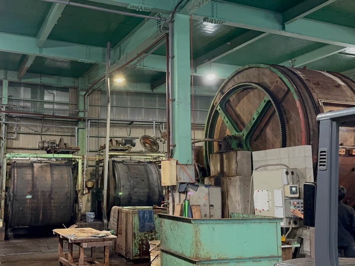 こちらは国内タンナーの工場。大きな機械なので、一度回し始めたら、できるだけ回し続けたいと考えるのが一般的です。