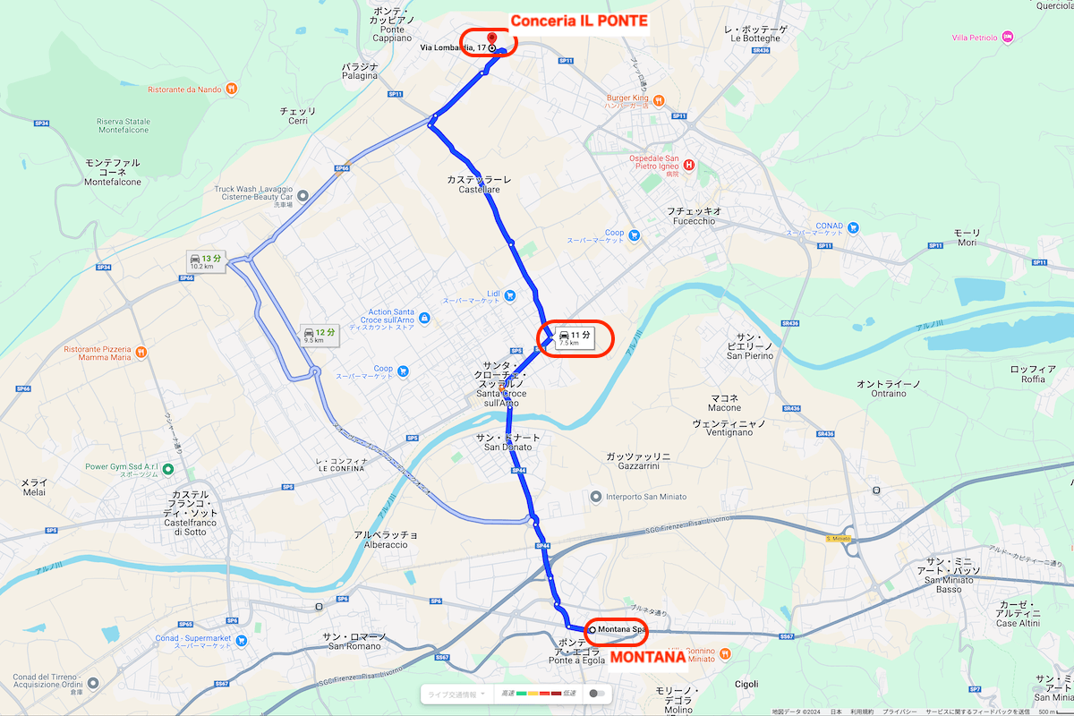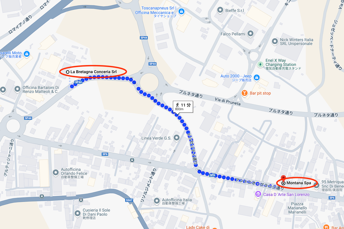 またGoogleマップを見ると、ともに弊社と親密な関係性があり、ライバル同士でもある『MONTANA』社と『Conceria La Bretagna』社が歩ける距離に位置していることが分かります。