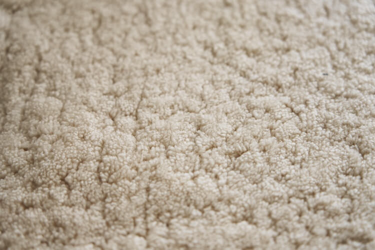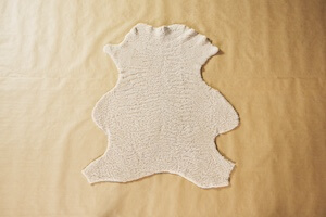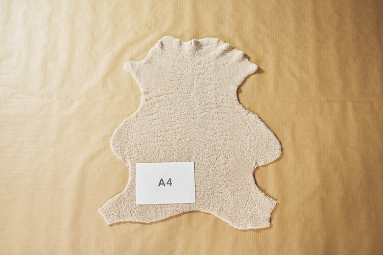 原皮はオーストラリア産の羊皮で、イタリアで生産されています。世界中で飼育されている羊は個性もサイズもまちまちですが、このムートンの羊は50-70DSくらいのサイズ。ムートンカーリーヘアーは羊本来の毛の特徴を生かして加工していて、毛並みは実に厚みがあります。
