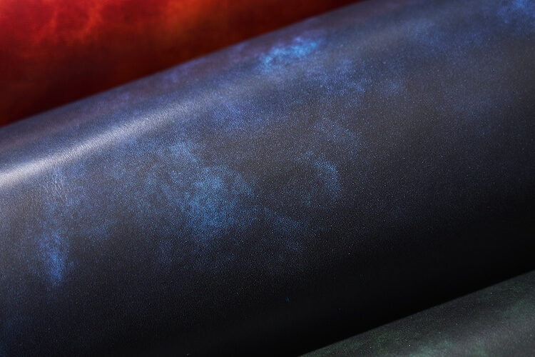 時間をかけた伝統的な鞣し工程の典型的なボックスカーフ鞣しに昔ながらの手染め加工を施していますので、手作りの職人技法がいきている革です。